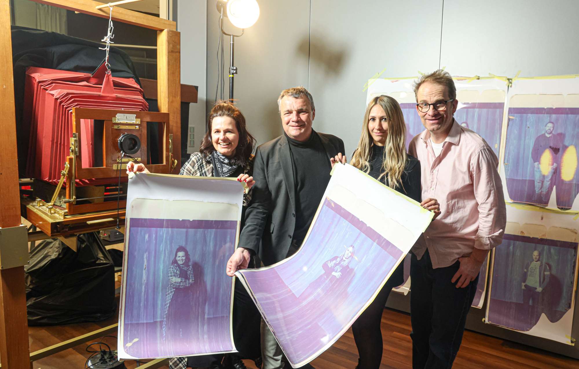 Im Bild bei der größten Sofortbildkamera der Welt v.l. Jasmin Stanonik (eine der Gewinner:innen des Porträts), Landesinnungsmeister Franz Neumayr, Manuela Lindhuber (ebenfalls eine Gewinnerin) und Florian Kaps (Eigentümer der großen Polaroid Kamera). Foto: WKS/ Franz Neumayr