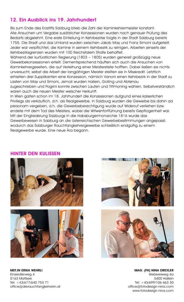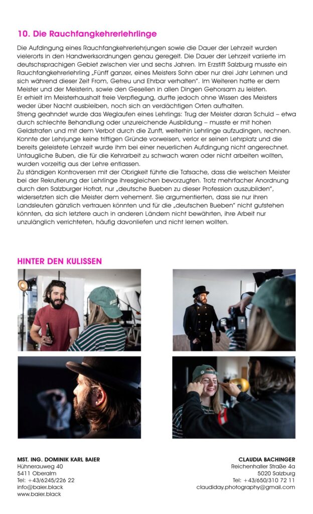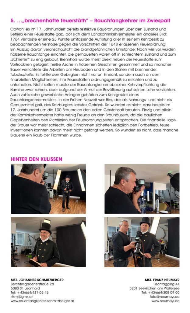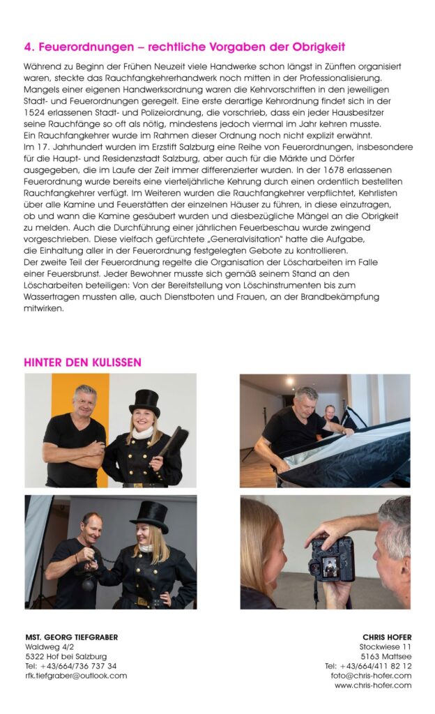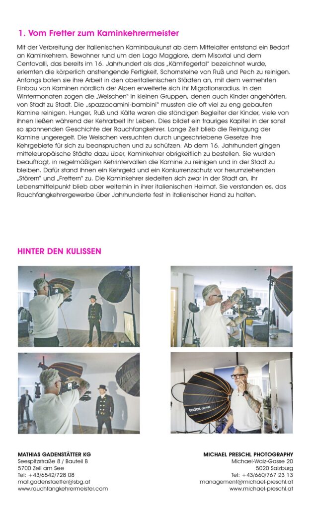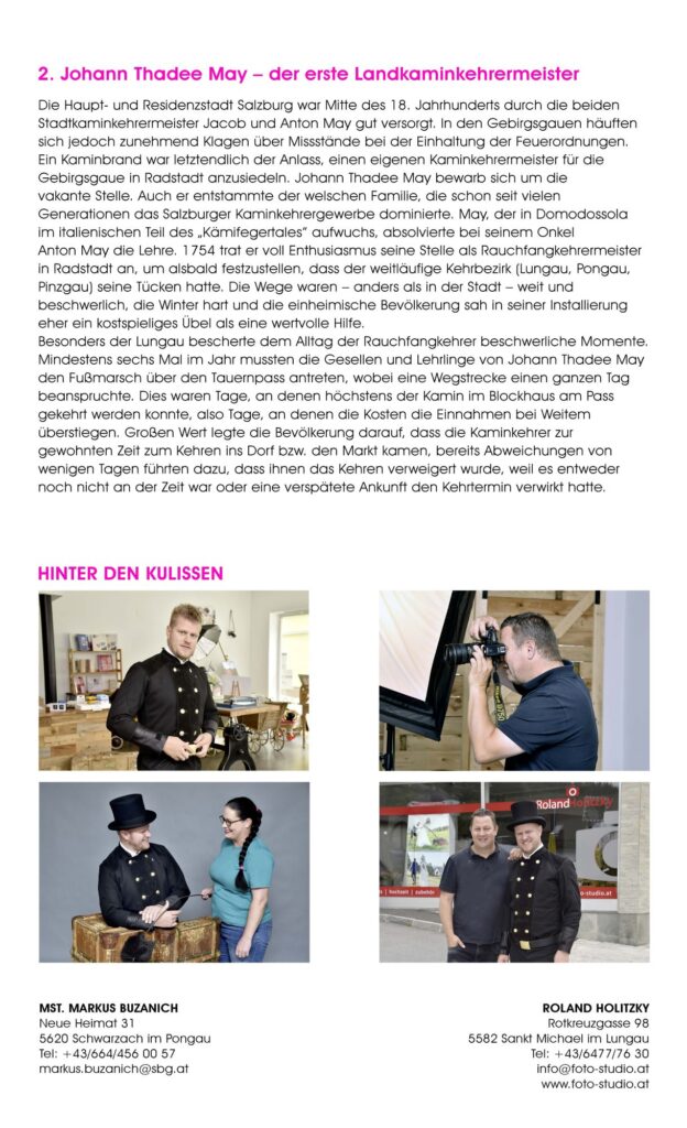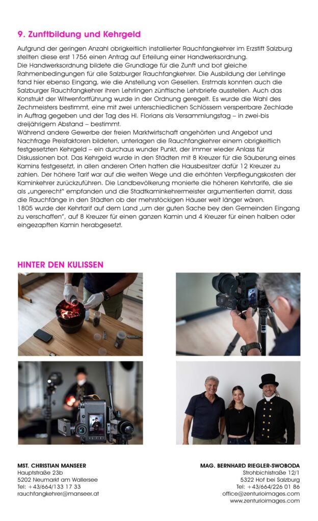 Was eint die Salzburger Rauchfangkehrer:innen und die Salzburger Berufsfotograf:innen? Beide Innungen stehen, wie viele anderen Berufsgruppen auch, für Qualitätsarbeit. Wenn auch in sehr unterschiedlichen Bereichen. Während die Rauchfangkehrer:innen als Schützer:innen von Leib, Leben und Gesundheit der Einzelnen und Botschafter:innen unserer Umwelt tätig sind, zeichnen sich die Berufsfotograf:innen dadurch aus, unwiederbringliche Momente der verschiedensten Art bildlich festzuhalten und damit für die Zukunft zu sichern.