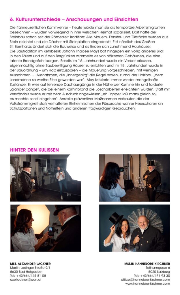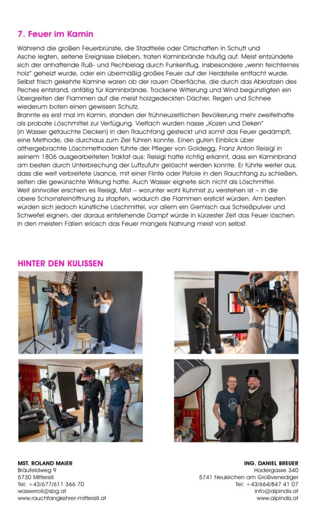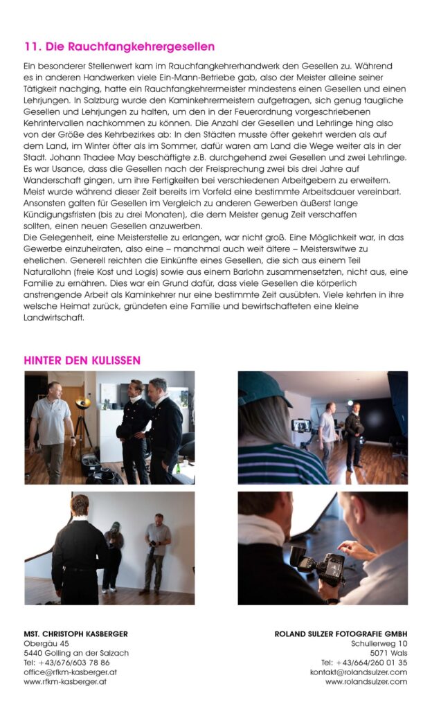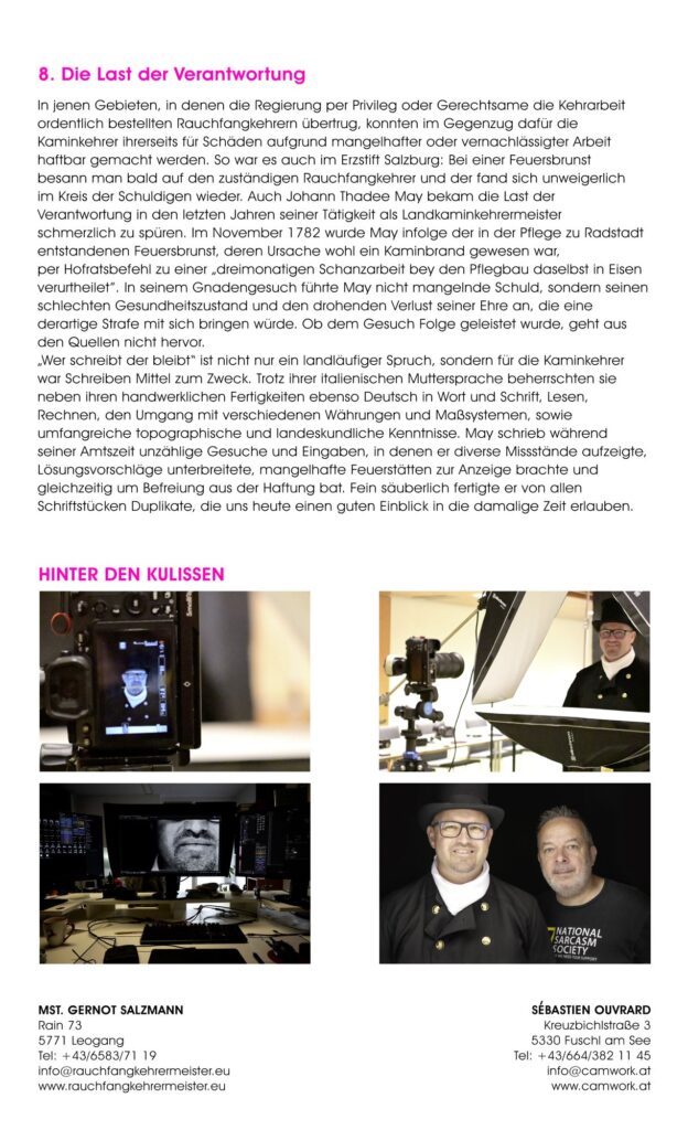 Mit dem nunmehr zum fünften Mal erschienen „Rauchfangkehrerkalender“ wollen beide Innungen ein ganzes Jahr lang einen Einblick in ihre Arbeitswelt geben. Die „Making-of-Bilder“ auf der Rückseite jedes Kalenderblattes erlauben einen Blick hinter die Kulissen beider Handwerke.